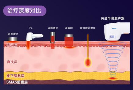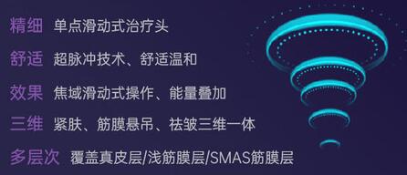 超聲炮選用的微點聚焦和大焦域的方法,實際上是沒法提升技術(shù)要求的讓步之舉。這類大區(qū)域加溫較為容易損害SMAS的附近組織,造成人體脂肪坍塌等問題。