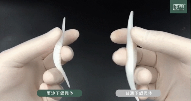 1.表面結構創(chuàng)新:雨沙下頜假體的設計采用特殊結構,中間寬厚,兩側細薄,形成微笑弧度。這種設計能夠更好地貼合面部輪廓,避免下滑和位移,從而術后效果更自然、更立體。