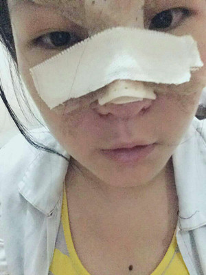 整個鼻子都用紗布包著,還有些腫,其實還疼,這幾天肯定是不能好好的吃東西了