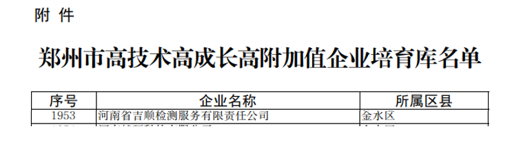 喜報!近日,河南省吉順檢測服務(wù)有限責(zé)任公司成功入選鄭州市“三高”企業(yè)培育庫。2022年01月04日,鄭州市工信局發(fā)布《關(guān)于公布鄭州高技術(shù)高成長高附加值企業(yè)培育庫名單的通知》。河南省吉順檢測服務(wù)有限責(zé)任公司,被納入鄭州市高技術(shù)高成長高附加值企業(yè)培育庫。